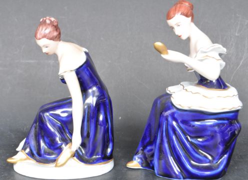 A pair of vintage 20th century Royal Dux porcelain figurines, one of a lady holding a mirror, the other with a lady fitting a shoe with doves. Both with pink triangle marks and registration numbers.