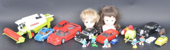 A collection of vintage 20th century toy vehicles comprising of cars, trucks, lorries and more. Together with two children's toy heads