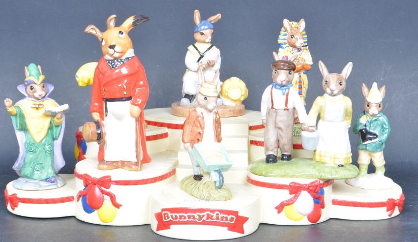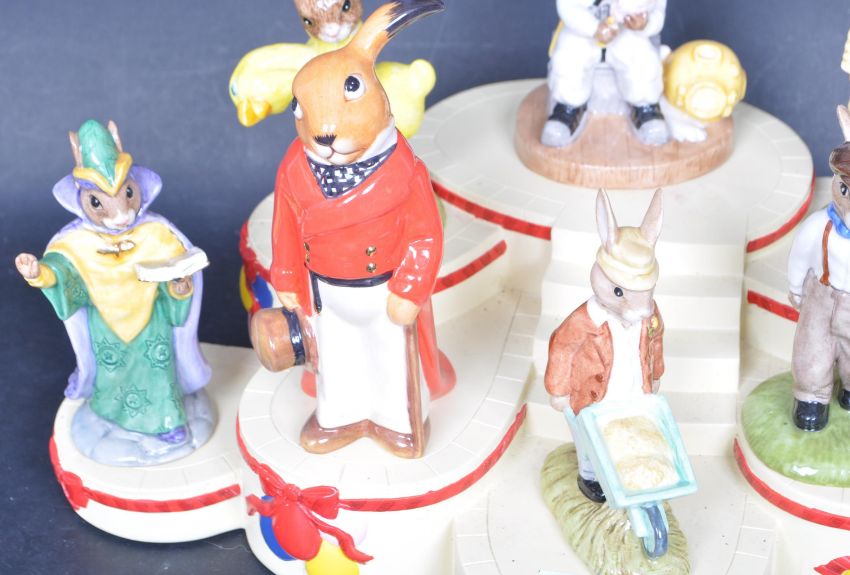 A collection of vintage 20th century Royal Doulton Bunnykins ceramic figures to include Jack and Jill, Gardener Bunnykins, Boy Skater Bunnykins, Mystic Bunnykins, Deep Sea Diver Bunnykins, Bunnykins of the year 2009, Easter Parade Bunnykins. Alongside the Occasions Collection Base. Measures 14cm tall.