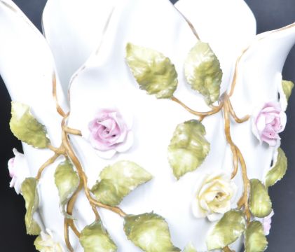 A pair of 20th century Sitzendorf floral encrusted cherub - putti vases. Each with large cherub at base with floral encrusted white glaze vases with flared tops. Marked to the base. Measures 29cm tall..