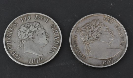 A 19th century George III silver half crown coin dated 1817. Gross weight 14.08g. Diameter 31mm. Together with a George III Silver half crown coin. Dated 1819. Gross weight 13.92g Diameter 31mm.