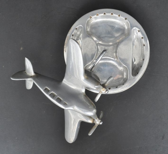 A vintage retro 20th century aeroplane piston head ashtray. The ashtray of a circular form with an twin propelled aeroplane decoration to the top. Measures 19cm tall.