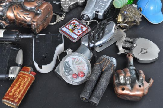 A large collection of vintage 20th century novelty lighters comprising of a Jalnd Elegance Series smoking Set, a motorcycle lights, Army helmet lighter with compass, grenade lighter, electric shaver lighter, casino lighter, mobile phone lighter and more.