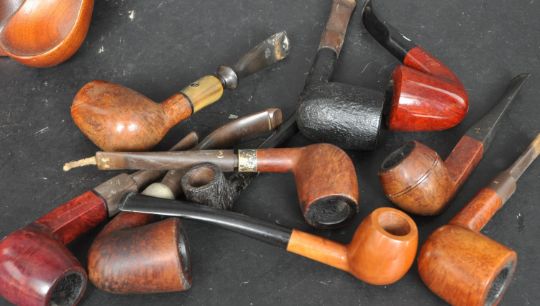 A collection of ten vintage 20th century pipes to includes brands such as Hardcastles - Old Bruyere, London Briar, Firex, Savinelli, Medico, Alpina and more. Measures 14cm long. Together with an hardwood eight pipe stand.