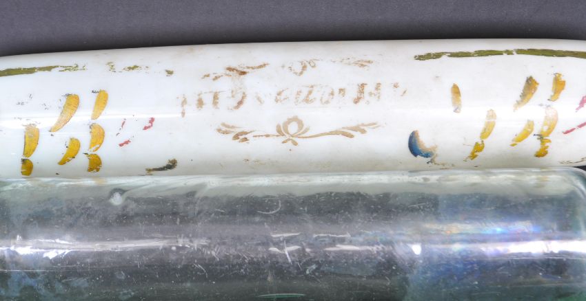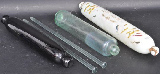 A collection of 19th Century Nailsea Glass to include, glass rolling pin and a Nailsea bristol blue glass rolling pin, rolling in with notation and two large Nailsea knitting needles. Longest measures 40cm.