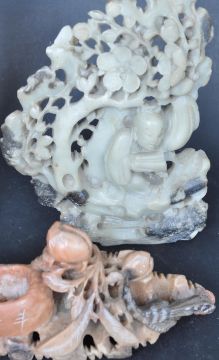 A good collection of 19th century and 20th century Chinese soapstone carved figurines and statues. To include mounted disk on stand, elders, deity, intaglio seal with animal mount along with others. Measures 19cm tall.