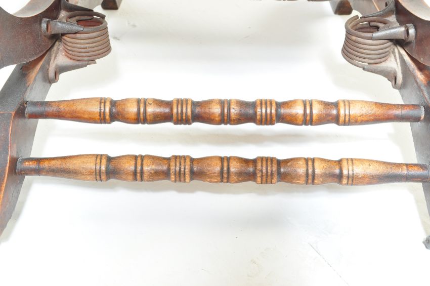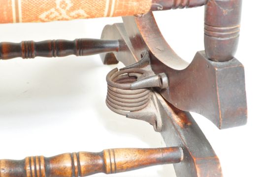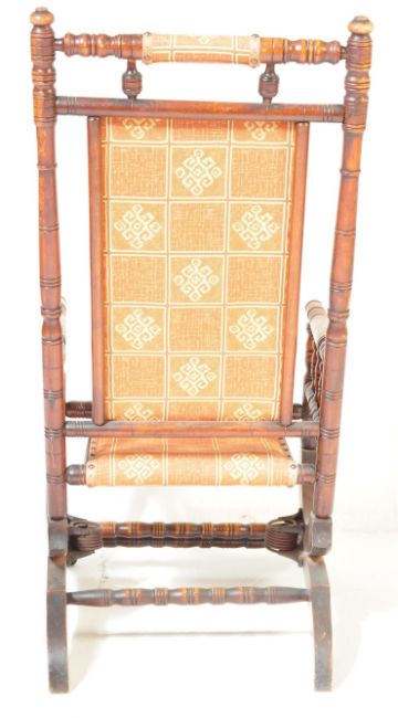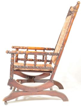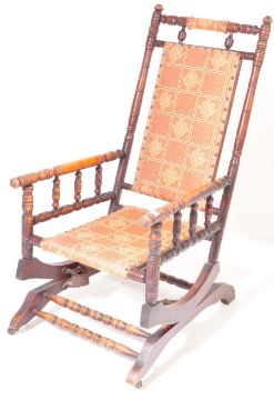 A late 19th Century Victorian mahogany aesthetic movement Boston Rocker - American Rocking chair / armchair. Raised on sleigh base with sprung rock action, upholstered seat with spindle gallery arms and backrest. 104cm h x 55cm w x 70cm d