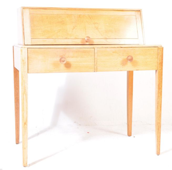 A mid century Cotswold School walnut retro bureau office desk by Arthur Reynolds, Ludlow being raised on tapering legs with drawers and appointed bureau atop. Measures: 100cm high x 92cm wide x 56cm deep.