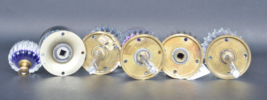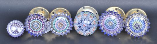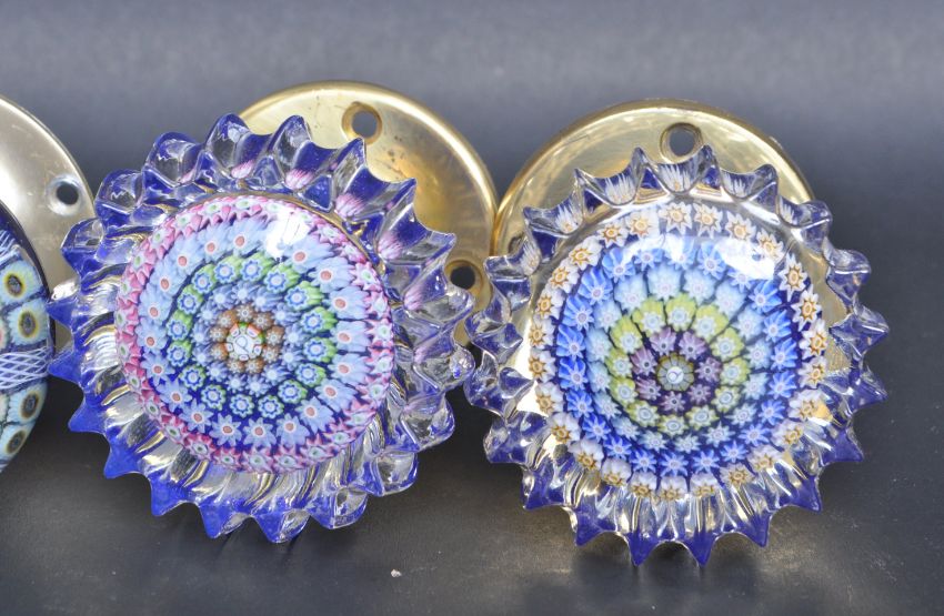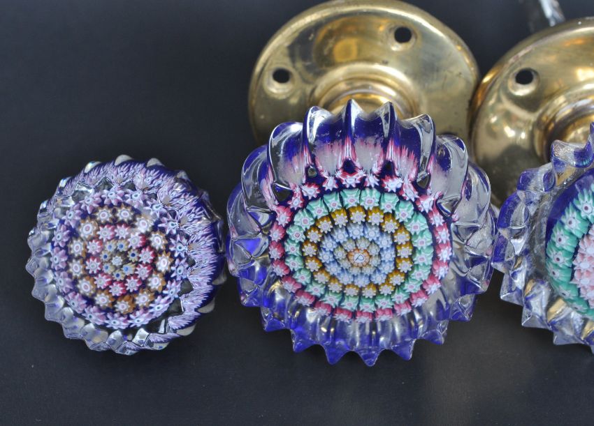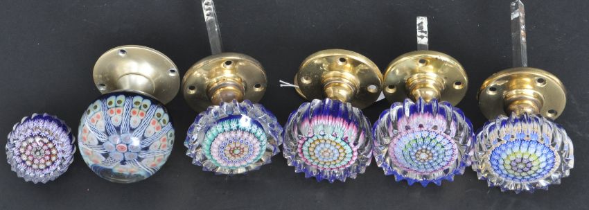 A set of five vintage retro circa 1960’s Peter McDougall paperweight door handles / door furniture. The art studio door handles having scalloped edges, set with millefiori canes one with PMcD cane together with a similar Art Studio paperweight door knob.