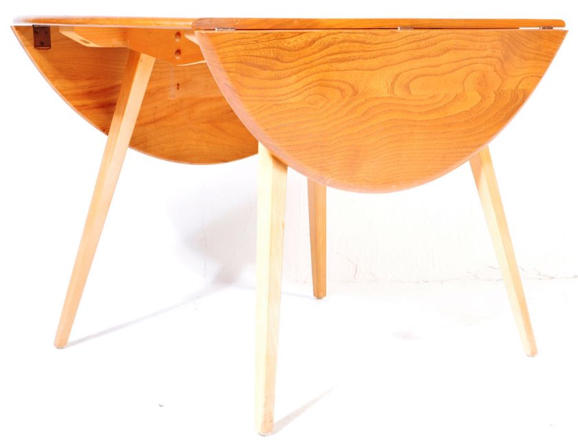 Ercol - Lucien Ercolani. A retro vintage 1970s light beech and elm drop leaf dining table of circular form having a chamfered edge raised on square tapering legs united by cross stretchers. Ercol stamp to the underside. Measures approx. 72cm x 123cm x 113cm (Extended)