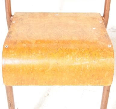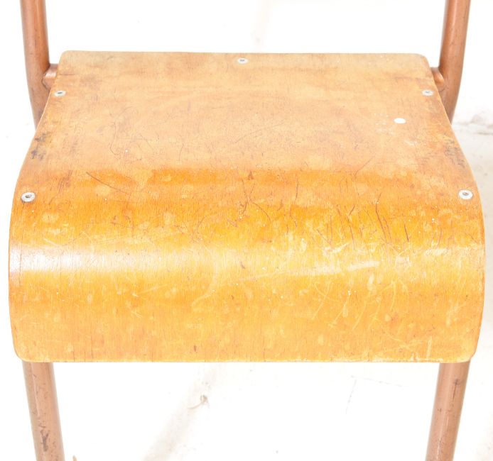 A set of 10 vintage retro 20th century children staking chairs. The chairs having playwood backrests and seats raised on metal tubular supports. Measures approx. 56cm x 33cm x 33cm.