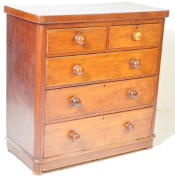 A 19th century Victorian mahogany chest of drawers having a bank of two over three drawers with turned handles raised on an upright base. Measures approx. 101cm x 101cm x 47cm