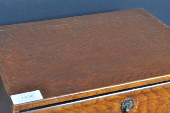 A vintage 20th century Chinese Oriental figured hardwood campaign chest having a configuration of drawers with drop handles raised on a plinth base. Measures 26cm x 24cm x 28cm.