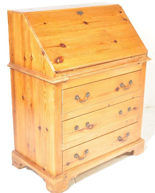 A vintage 20th century pine bureau having a fall front writing area opening to reveal a fully appointed bureau atop a bank of three drawers brass swan neck handles raised on bracket feet. Measures approx. 110cm x 80cm x 50cm.
