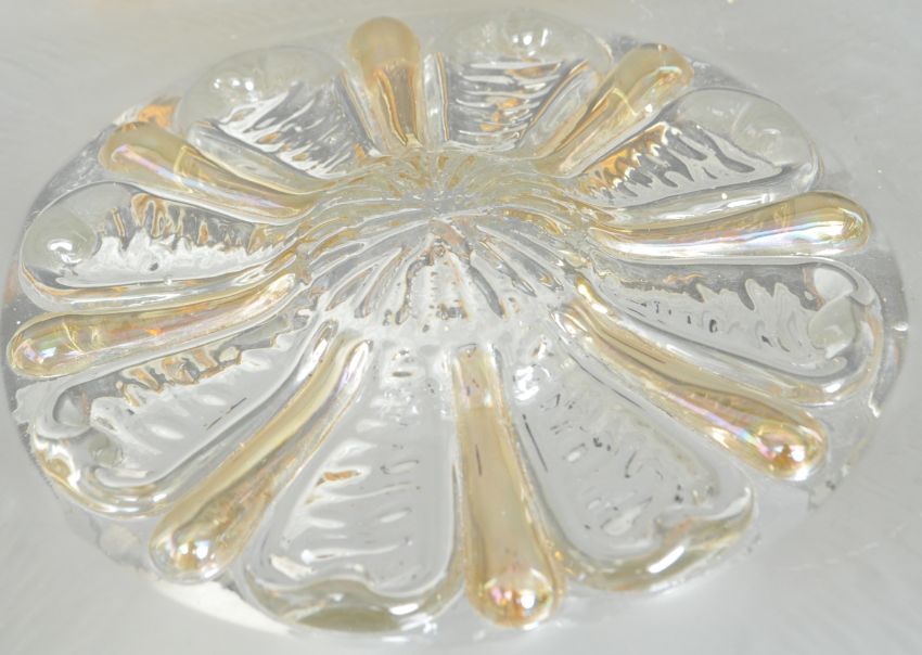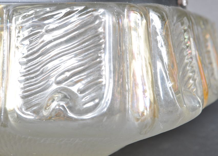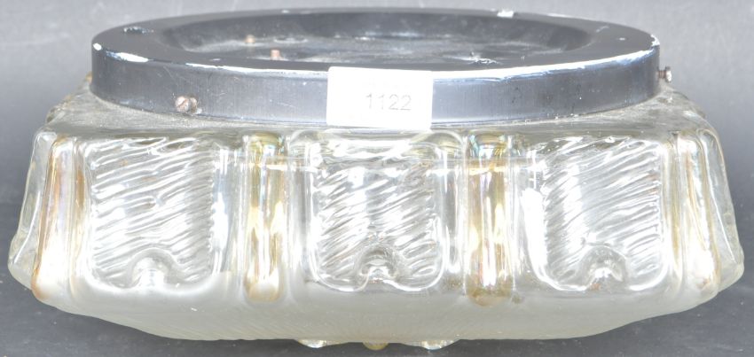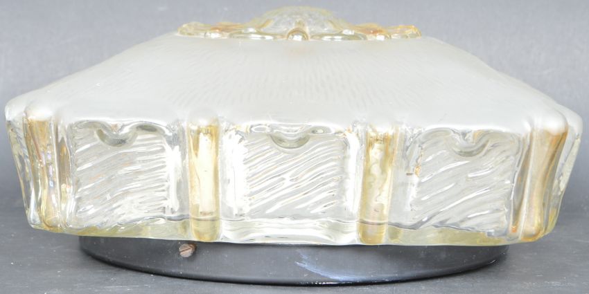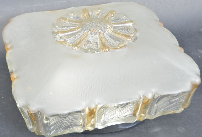 A mid 20th century circa 1950s pressed glass ceiling light of square form having a raised central floral motif. Measures 28cm