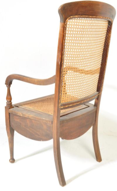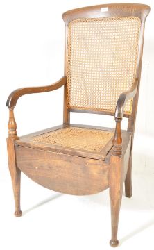 An early 20th century circa. 1920s commode bergere style oak chair. The chair having a shaped top rail with rattan back and seat with white white porcelain chamber pot beneath (AF) and shaped elbow rests. 108cm h x 57cm w x 55cm d