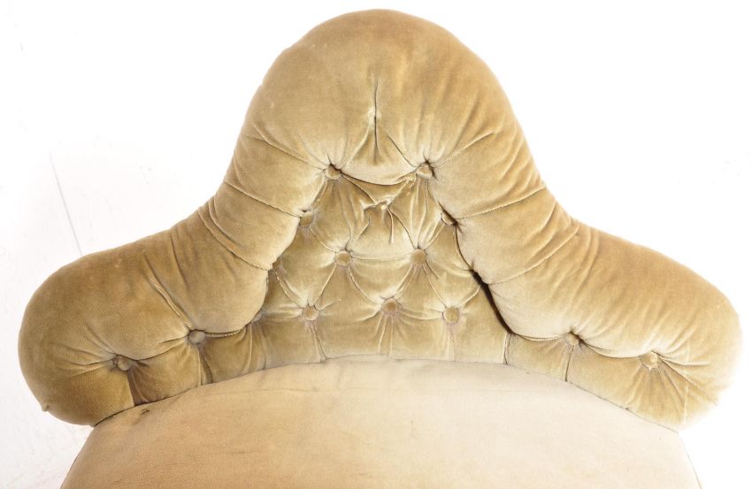 A VIctorian 19th century ebonised mahogany  bedroom chair / nursing chair. The chair having a shaped button backrest, circular seat upholstered in green velvet raised on turned ebonised supports with brown ceramic castors. Measures approx.74cm x 78cm x 68cm.
