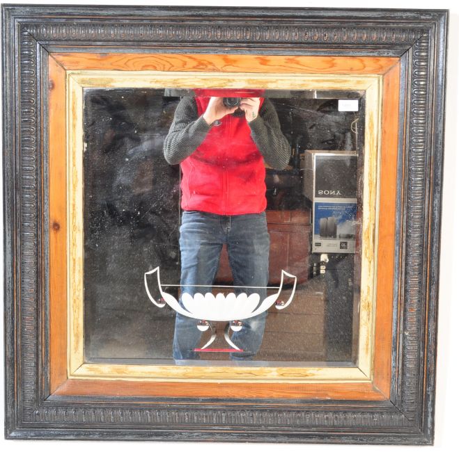 A large 20th century mirror of square form having a carved wooden frame with gilt brass & pine slip with central glass panel etched with a botanical urn. Measures approx; 89cm x 89cm
