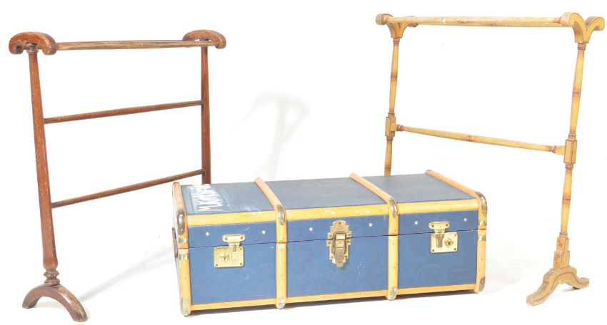 A Victorian 19th century stencil decorated painted towel rail with flared twin rail top over block and turned column supports together with a later stained pine example. 86cm h x 76cm w x 20cm d