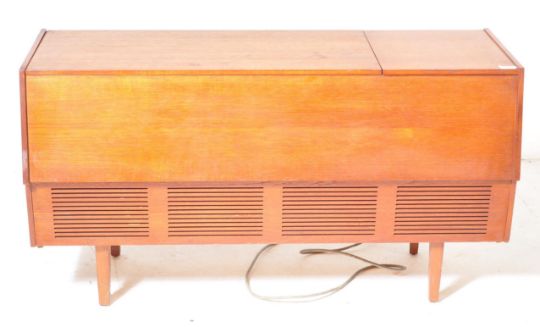 A mid century retro teak wood radiogram / stereogram. The radiogram having tapering legs with rectangular body having grilled front. The top opening to reveal record deck. Measures approx. 81cm x 113cm x 38cm.