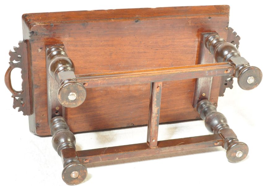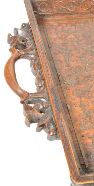An early 20th Century Persian / Indian inlaid tray on stand / small occasional coffee table. The tray top having carved handles and slanted sides with inlaid brass work throughout. Raised on turned leg base. Measures approx. 32cm x 70cm x 37cm