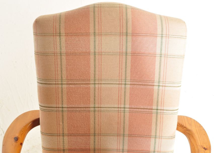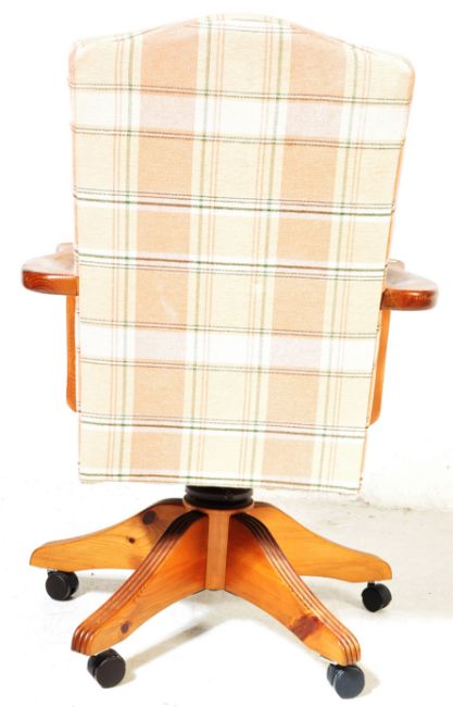 A contemporary captains swivel office chair of pine construction with tartan upholstery and shaped elbow rests. Castors to the base.90cm h x 56cm w x 62cm d
