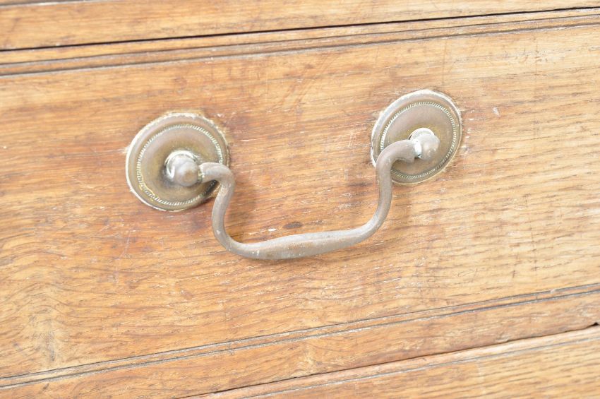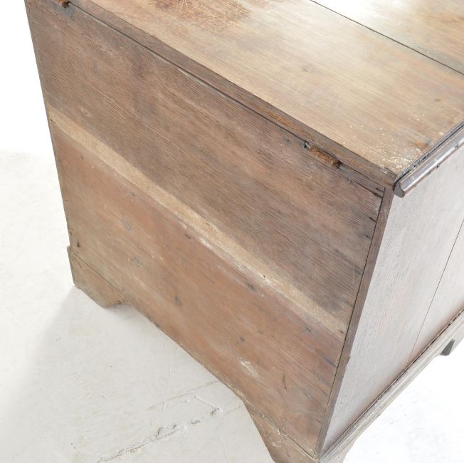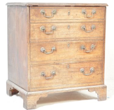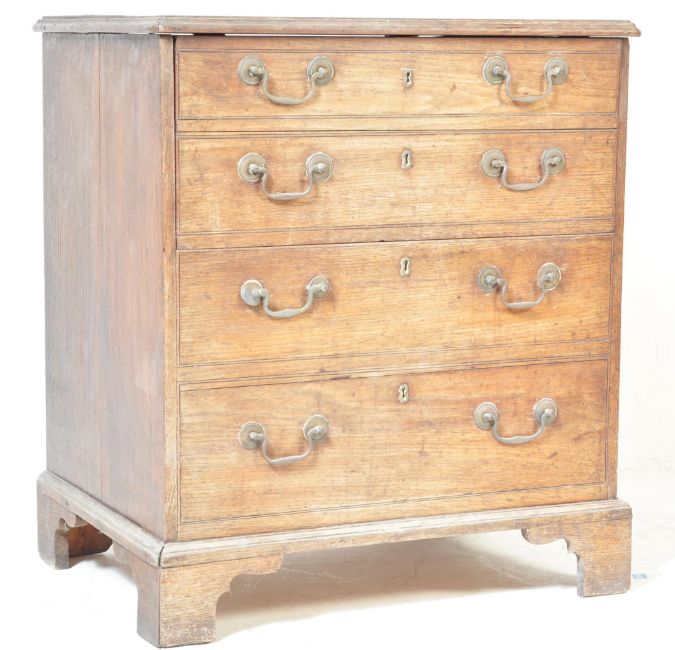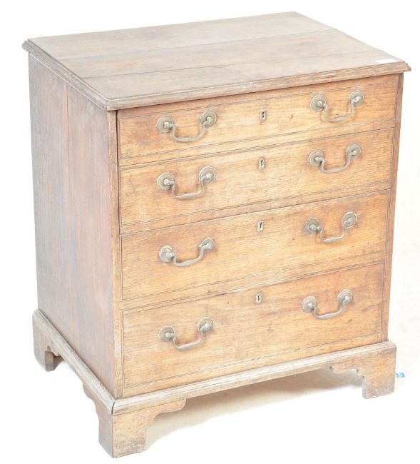A 19th century George III oak bachelors chest commode. Raised on bracket feet with a faux drawer front having brass swing handles. Hinged top and front opening to reveal commode space. 72cm h x 64cm w x 46cm d