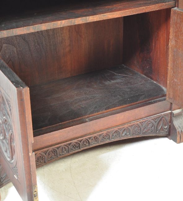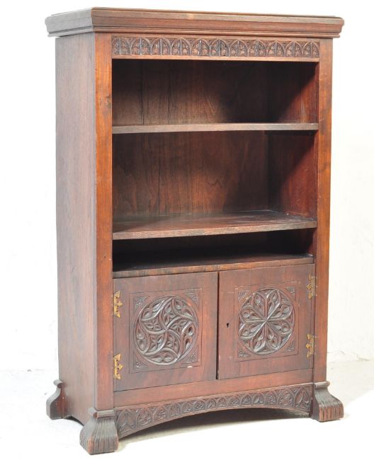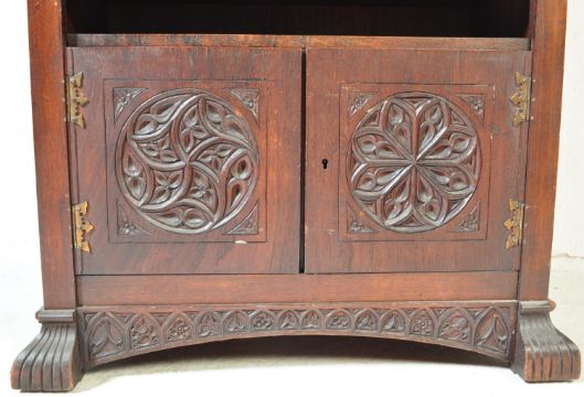 An early 20th century circa 1930s Gothic Revival oak open faced bookcase having a flared chamfered top with a repeating gothic motif to the frieze. The bookcase having a set of two shelves with a carved double door cupboard raised on animal feet. 101cm h x 68cm w x 33cm d