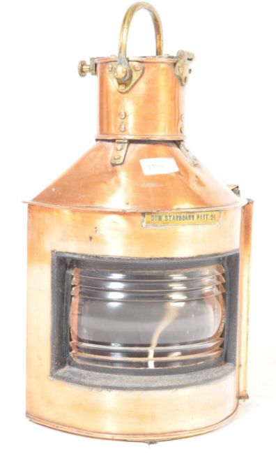 A vintage large copper bow Starboard Navigation lamp.. Copper and brass construction with handle and lit atop. The brass plaque marked Bow Starboard Patt 24. Measures approx. 47cm x 27cm x 23cm
