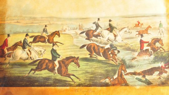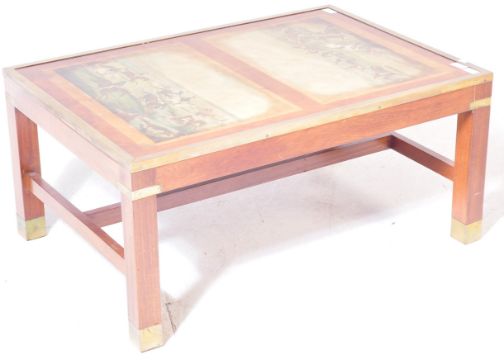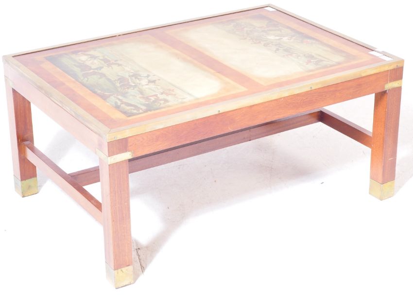 A 20th century campaign style glass topped coffee table of rectangular form having printed hunting scenes with brass edging raised on square supports. Measures approx. 42cm x 89cm x 61cm