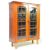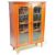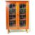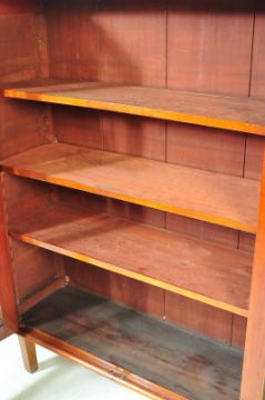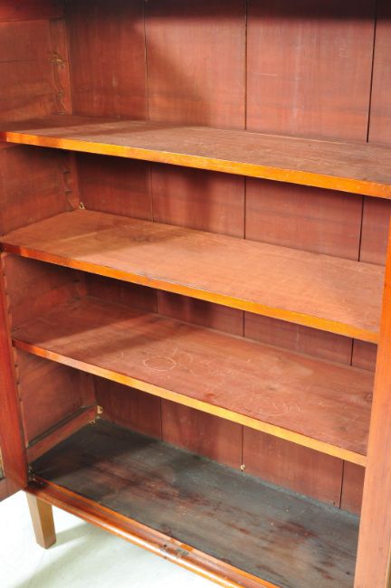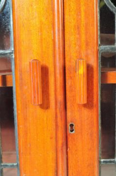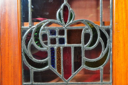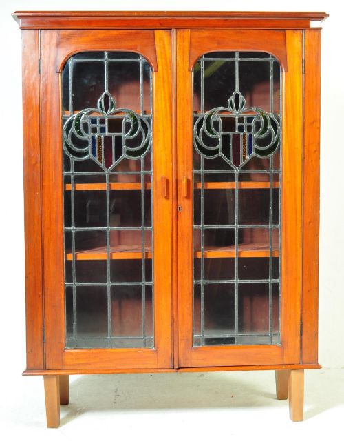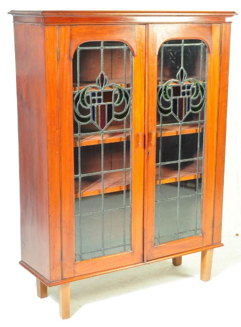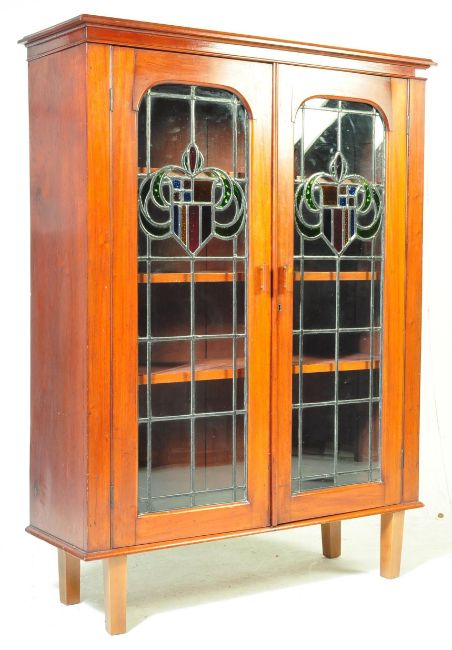 A 1920's large leaded and stained glass bookcase display cabinet. Raised on later feet with twin large leaded glass panel doors with stained glass armorial shaped panes to centre. Shelves set within. Measures 151cm H x 113cm W x 38cm D