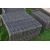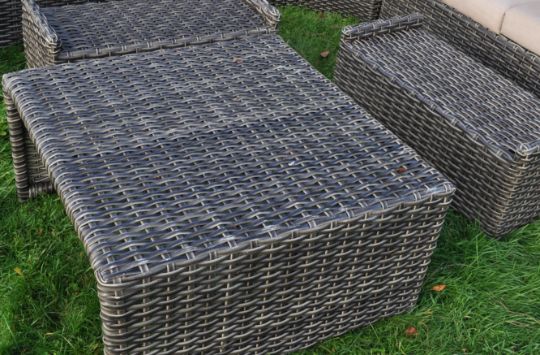 A large contemporary outdoor garden corner sofa suite by Creative Living in faux rattan plastic weave in grey colourway. The suite comprising corner sofa and occasional tables complete with cushions. Makers label to side. Measures 82cm x 262cm x 74cm. (The 262cm is combined measurements of the back of the sofas)