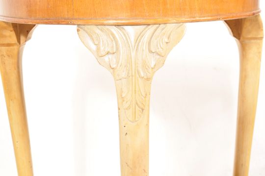 A french 20th Century walnut bedroom suite comprising of a bedside cabinet with single drawer atop and console table having a quarter veneer top raised on shaped supports decorated with foliate motifs  to the shoulders. Measures approx. 79cm x 49cm x 31cm