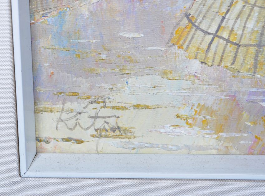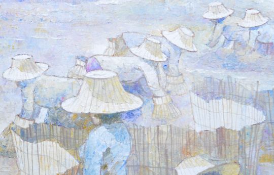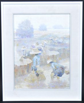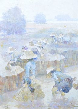Kitja Noree - A vintage 20th century oil on canvas painting of workers in a Thai rice paddy field. Artist named Kitja Noree. Framed. Measures 54cm x 40cm
