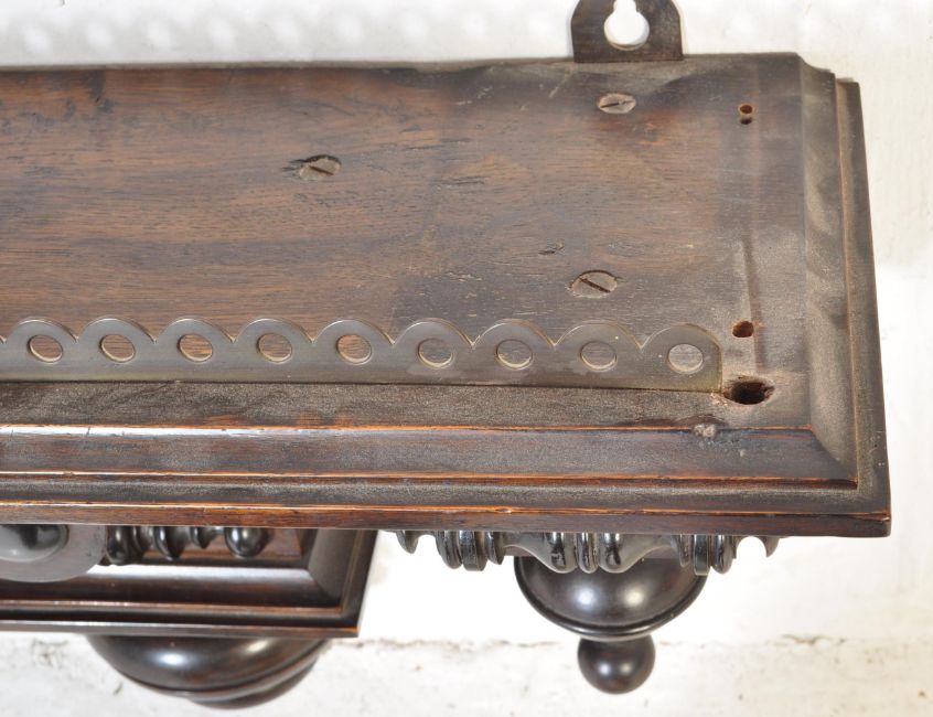 A 19th century Victorian mahogany clock bracket. The decorative bracket with inverted finial base and carved, detailed surround. Shelf set atop. Measures approx. 33cm x 50cm x 19cm