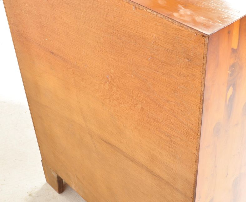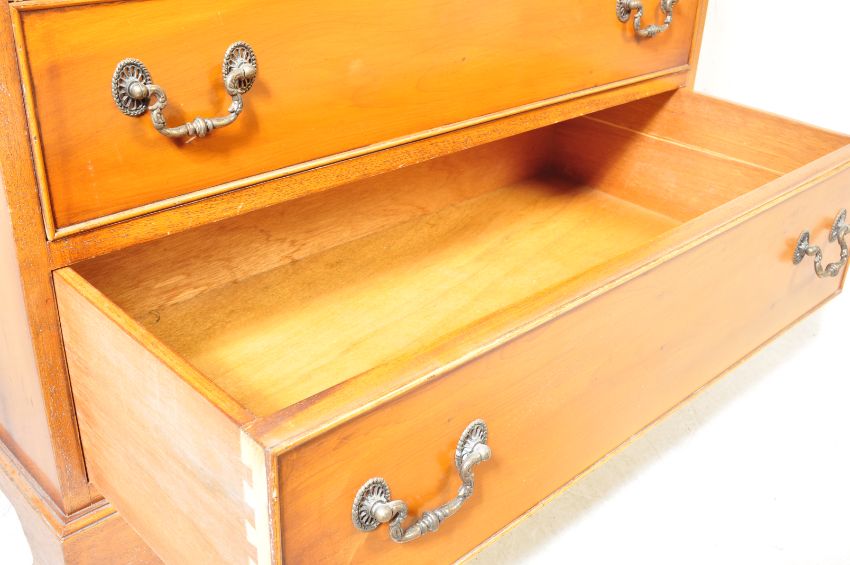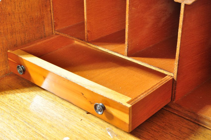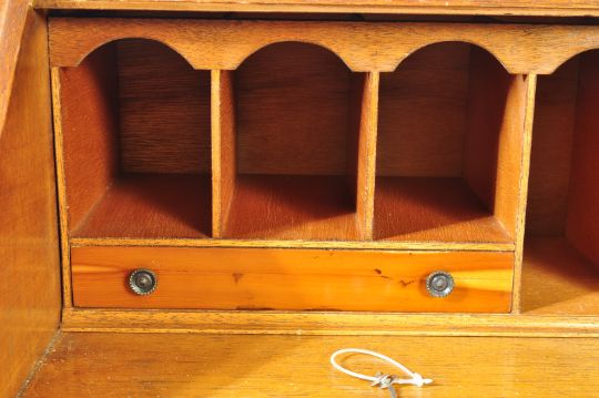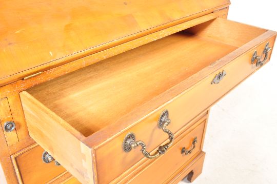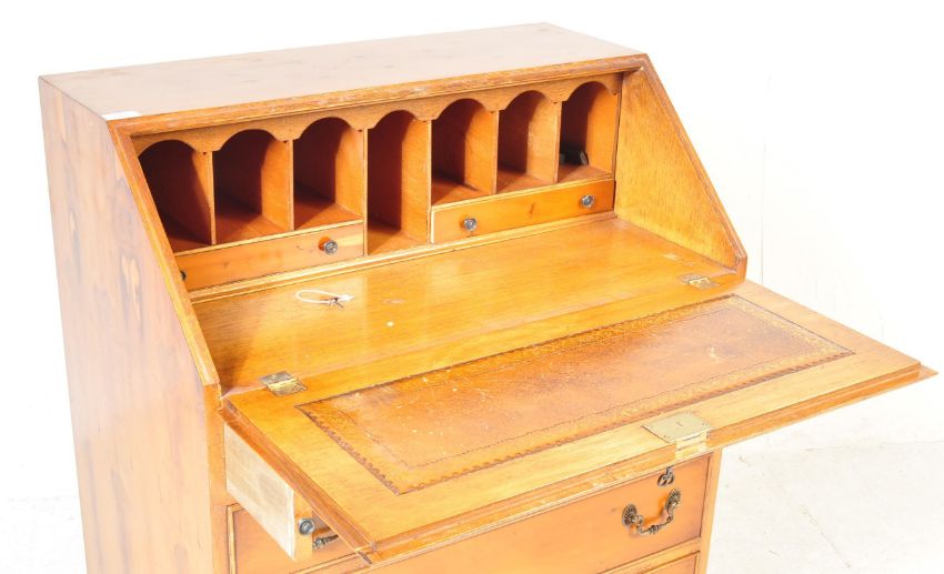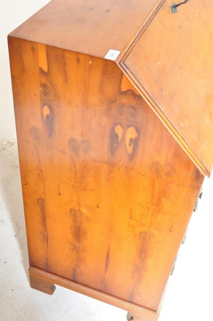 A Regency revival yew wood bureau desk. The bureau being raised on bracket feet with a bank of drawers under bureau top above. The fall front bureau having a fully appointed interior set within. 98cm h x 75cm w x 45cm d
