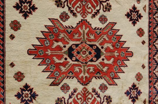 A mid 20th century Persian Afghan wool on wool carpet rug having three large brown medallion on a cream field decorated with trees to the corners, dark blue main border decorated with diamond lozenge shaped motifs. Grey fringes to each end. Measures approximately: 109cm x 155cm.