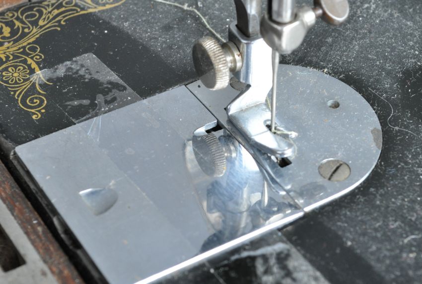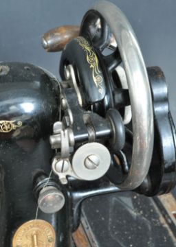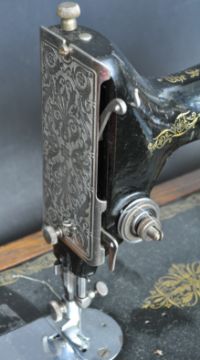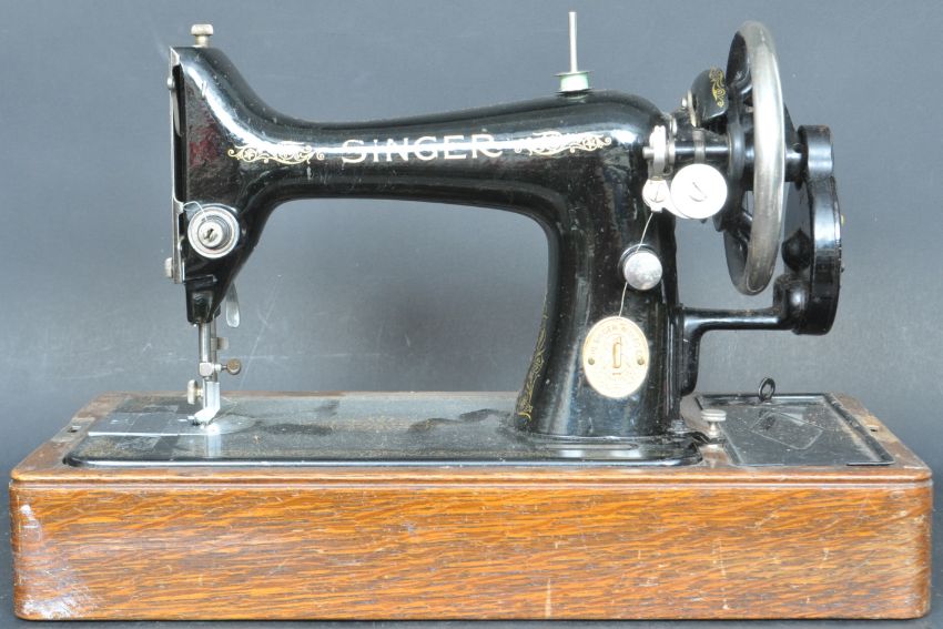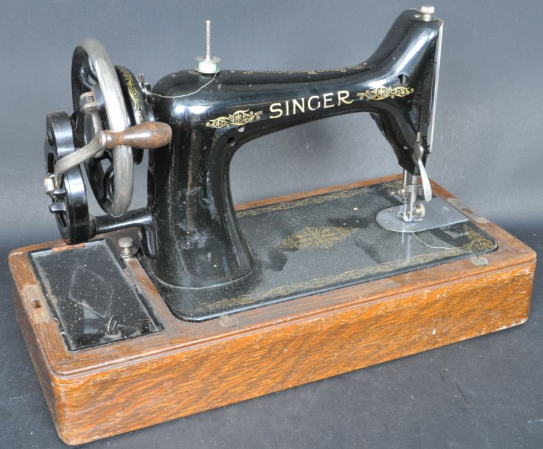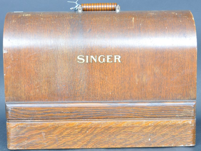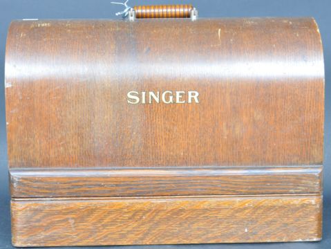 A vintage 20th century manual cased Singer sewing machine having an ebonised black body with gilt detailing. Serial number Y5618447. Held within a mahogany wooden case with key. Measures 44cm in length.