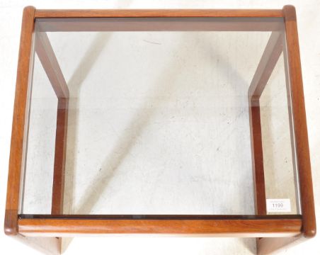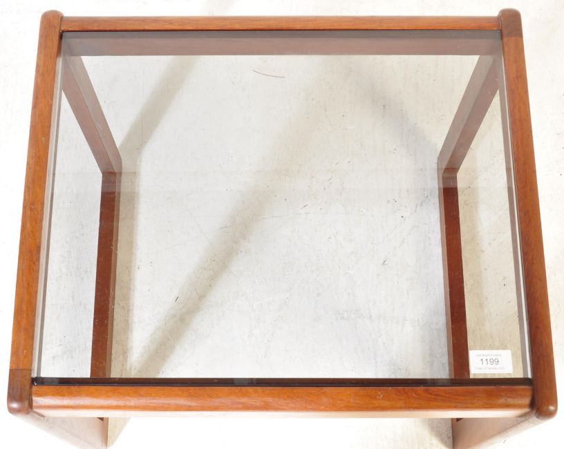 A vintage retro mid 20th century Danish inspired teak wood nest of tables. The graduate nest of three tables having teak wood frame with smoked glass tops. Measures approx. 43cm x 51cm x 43cm
