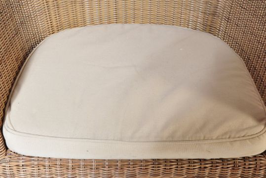 A contemporary faux rattan weave conservatory suite. The suite comprising a pair of plantation style armchairs with beige cushions together with a matching ottoman footstool and also a side table. Measures approx. 90cm x 78cm x 71cm