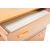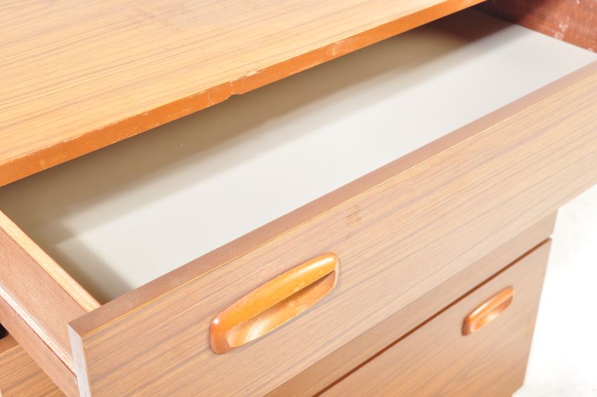 A retro mid century teak wood veneer pedestal chest of drawers by Schreiber. The chest being raised on castors having an upright bank of 4 drawers with recessed lozenge shaped handles to each. Flared simple chest top above. Measures approx. 73cm x 75cm x 43cm
