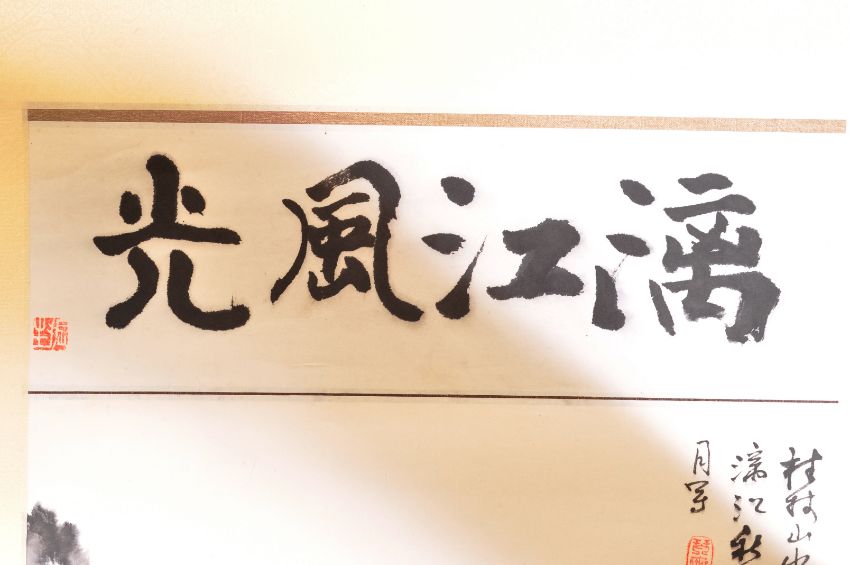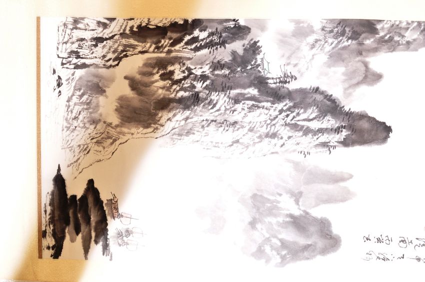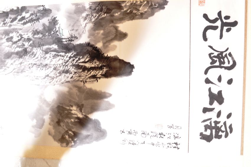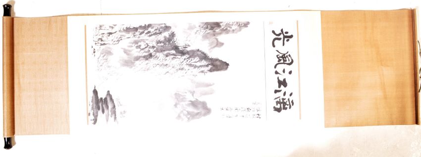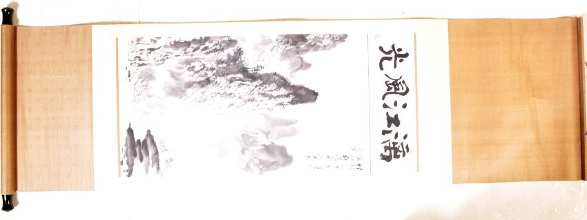 A vintage 20th century Chinese ink scroll having an ink calligraphic script featuring a mountainous landscape with fishing boats beneath. Mounted upon green patterned paper. Measures 158cm x 47cm.
