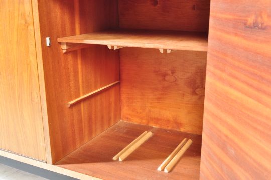 A mid century, circa 1950's retro walnut sideboard - credenza. The sideboard being raised on ebonised tapering legs with a series of drawers and cupboards having brass pull handles to the fronts, flared top above. Measures approx. 72cm x 137cm x 40cm.