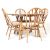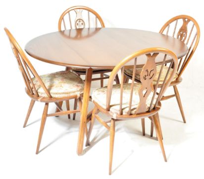 Ercol - Lucien Ercolani. A retro vintage 1970s dark elm drop leaf dining table of circular form having a chamfered edge raised on square tapering legs united by cross stretchers. Ercol stamp to the underside. Comes with four Ercol fleur de lys dining chairs. Measures approx. 72cm x 125cm x 113cm.