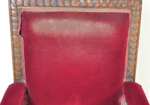 A Victorian 19th century mahogany carved library armchair. Raised on reeded turned legs with castors having red velour overstuffed seat and back rest flanked by lion head masks to the front of the armchair. The toprail with carved centre. Together with a  Victorian 19th century mahogany library armchair raised on turned legs with overstuffed upholstered seat and back rest. Measures approx. 102cm x 65cm x 80cm