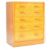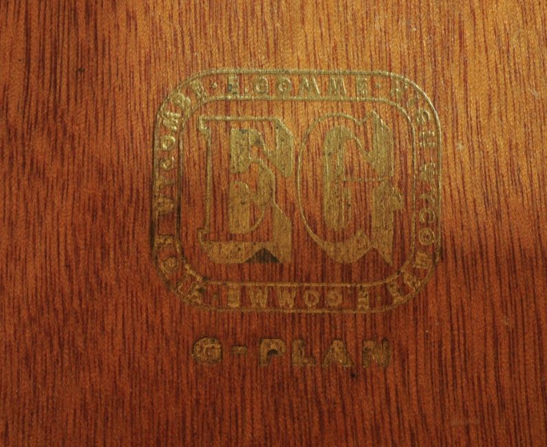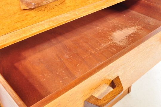 E. Gomme - G Plan - Brandon Range - A retro vintage mid Century golden oak chest of drawers having a two over three graduating drawers with all having angular raised handles and being raised on a plinth base. 97cm h x 77cm w x 46cm d