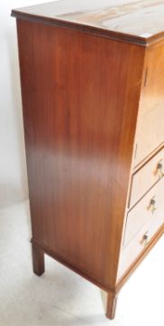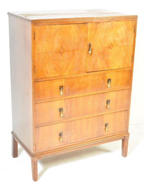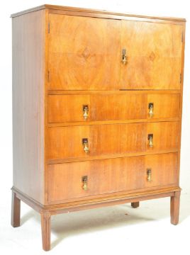 A Waring & Gillows 1930's Art Deco walnut tallboy chest of drawers. Raised on squared legs with a chest of drawers beneath a double door linen cupboard above. Finished with decorative handles to the drawers and doors. Impressed stamp to drawer with ivorine patent label. Measures 118cm H x 84cm W x 46cm D