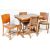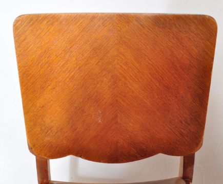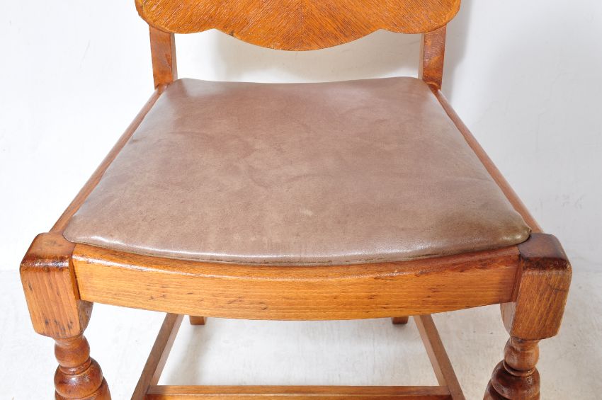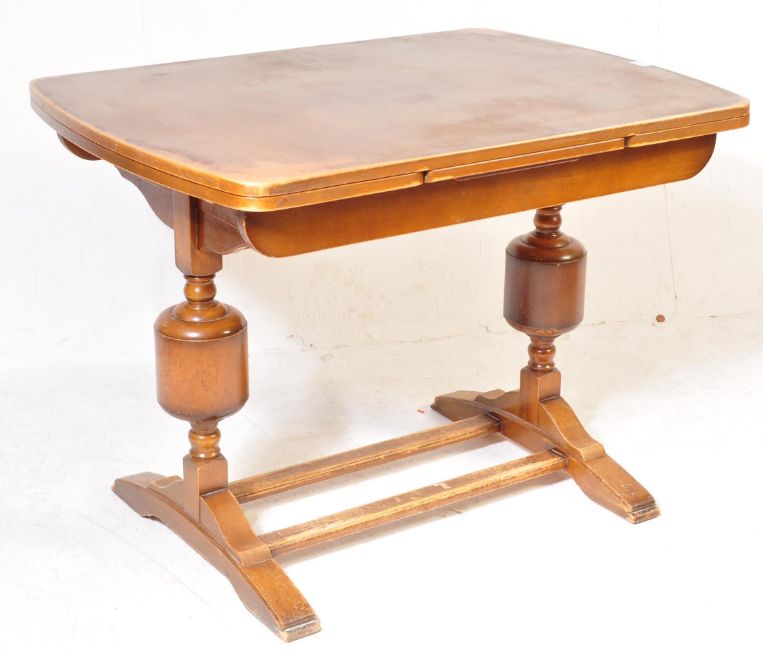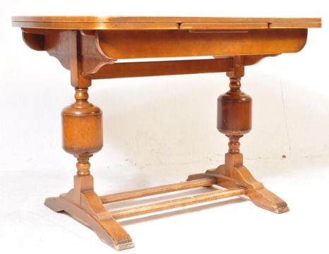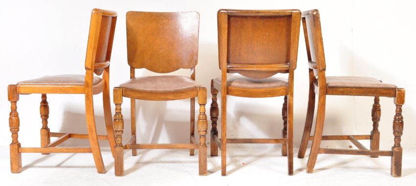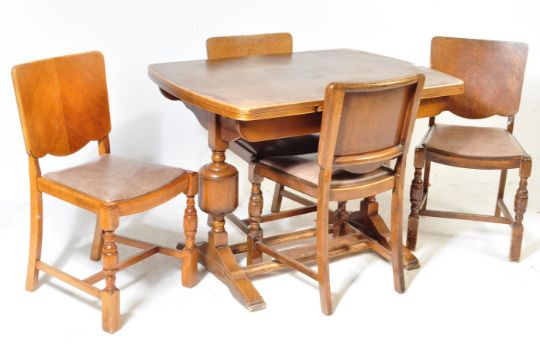 A 1940's walnut & oak refectory draw leaf dining table and matching set of 4 dining chairs. The table with cup and cover supports, extending table top above. The chairs with panel back rests over drop in seats and cup and cover legs united by stretchers. Measures 77cm H x 106cm W x 76cm D