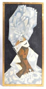 Bal Masqué - A framed oil on board painting depicting a lady in full attire with headdress and face mask ready for the masked ball. Unsigned and titled 'Bal Masqué'. Set within a gilt frame. Painting measures approx; 720mm x 340mm. Frame measures approx; 75cm x 38cm.