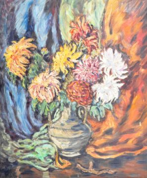 McGee Wiseman - A 20th Century oil on canvas still life painting depicting a vase of flowers with coloured drapes to the backdrop. Signed to the lower left. Set with a wooden frame. Painting measures approx; 600mm x 500mm. Frame measures approx; 82cm x 71cm.